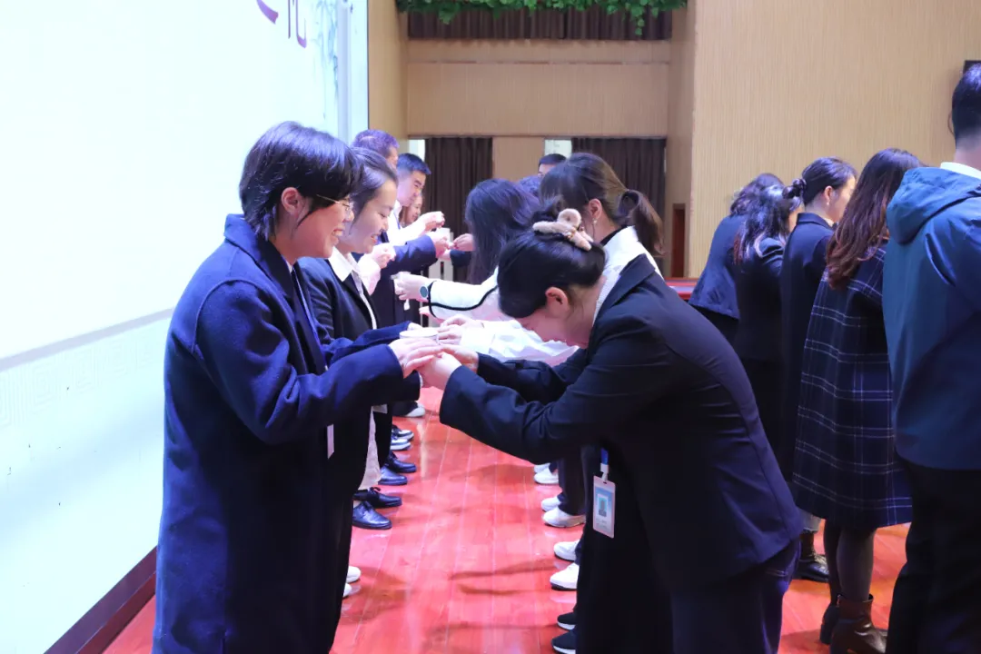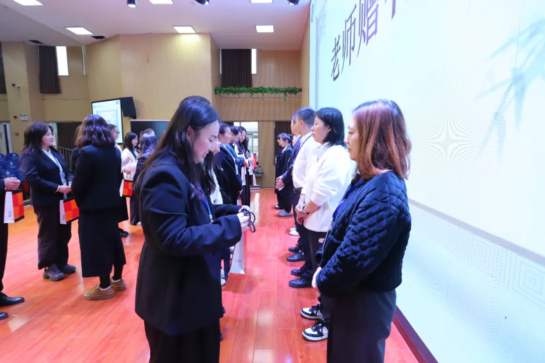 仪式伊始,副校长杨科宣读了本学年师徒结对名单,多位经验丰富的骨干教师与朝气蓬勃的青年教师正式缔结师徒关系。伴随着典雅的音乐,徒弟们依次向师傅行拜师礼、奉上清茶,以传统仪式表达对师傅的由衷敬意与求学热忱;师傅们则回赠钢笔,寓意“妙笔生花”,寄托对徒弟勤耕教坛、书写精彩教育人生的美好期许。