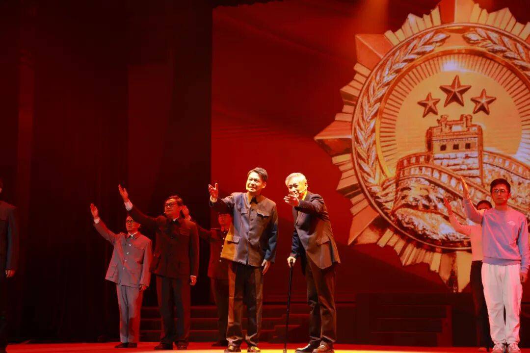 演出落幕,掌声经久不息。两弹话剧社的同学们怀着无比崇敬的心情,手捧鲜花走向舞台,向主创人员与演员们表达由衷敬意,与饰演邓稼先、杨振宁的演员亲密合影,定格下这一充满意义的瞬间。