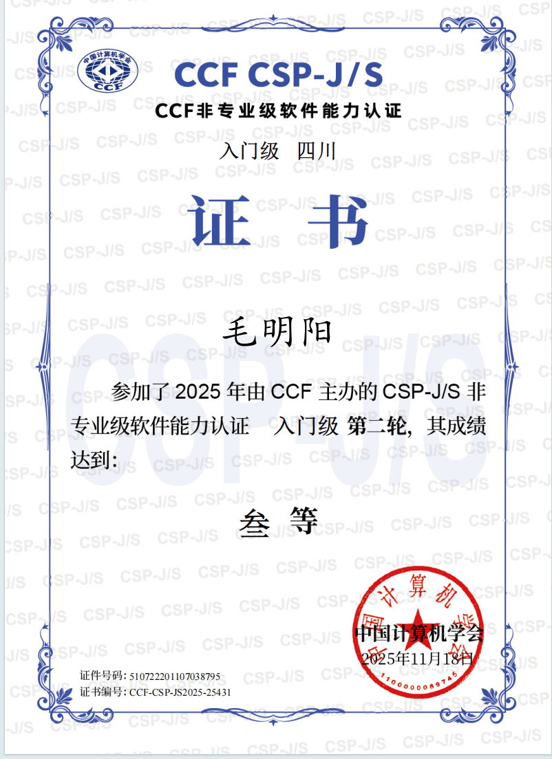 同时,在2025年CSP初赛阶段,我校学子同样表现优异取得不错的成绩。