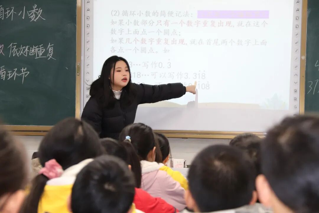 课堂上,高老师把“抽象概念”融进趣味实践中:从除法竖式演算中找“重复出现的余数”,用彩笔圈出循环节的“循环密码”,通过实例探究、互动演算等多样形式,让抽象的循环小数变得直观易懂,孩子们在思考与实践中轻松掌握知识要点。