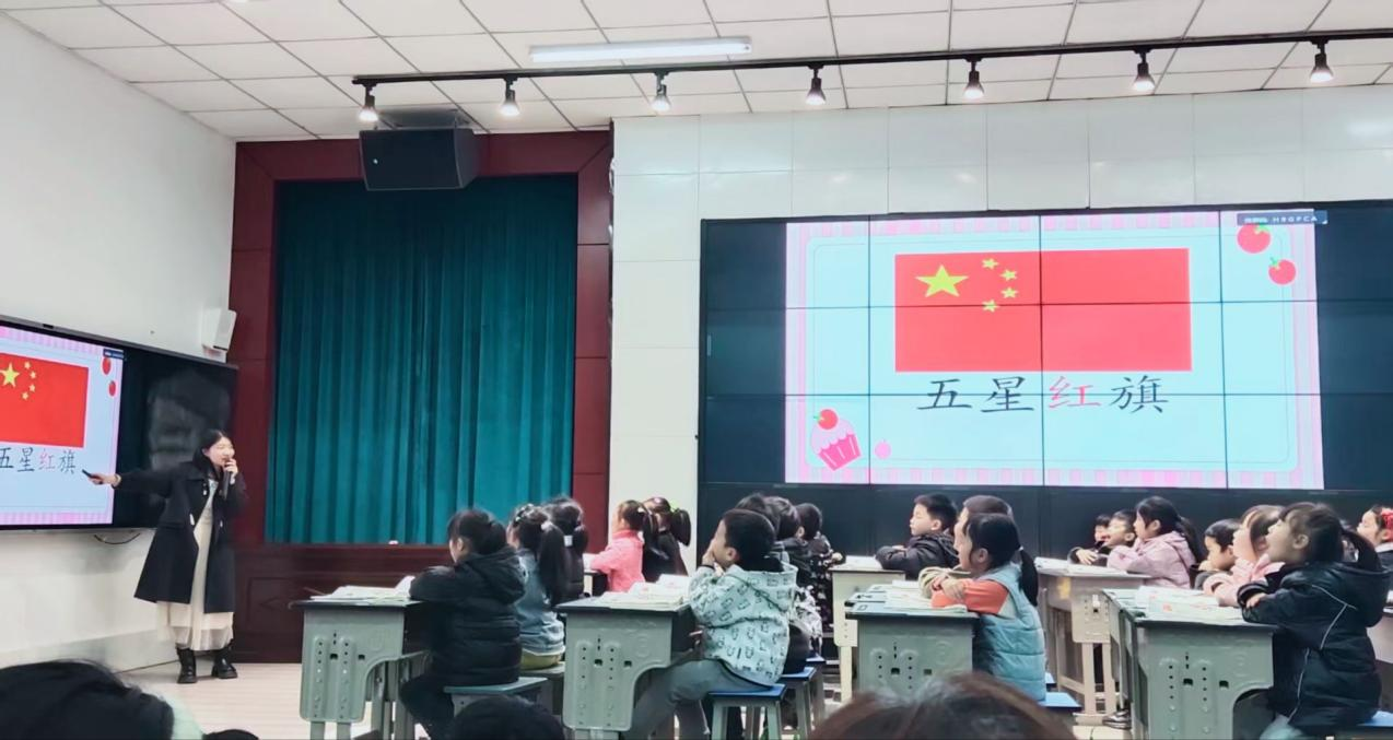 程蝶老师的《升国旗》课堂,以温柔而坚定地引导,将知识传授与情感培育深度融合。课堂伊始,程老师播放升国旗实景视频,引导学生分享生活中见过国旗的场景,迅速拉近学生与国旗的心理距离;识字环节中,她通过生字卡片直观呈现“升”“中国”“国旗”等核心词汇,以“国字框如围墙护宝玉”的生动比喻,拆解汉字结构的同时,悄然植入家国情怀;朗读教学时,教师配乐范读营造庄重氛围,结合升国旗视频引导学生模仿“徐徐升起”的动作,对着国旗练习敬礼,让每一个汉字都承载着对祖国的敬意;随后,通过分层朗读训练,让学生带着自豪、庄重、喜悦的情感反复品读“迎风飘扬,多么美丽”,深化情感体验;课堂尾声,师生共同唱响爱国儿歌,将对祖国的热爱稳稳根植于学生心中。整堂课以“歌声浸润、识字筑基、朗读传情”为主线,将国旗的象征意义与家国情怀的种子,潜移默化地种进孩子们的童年。