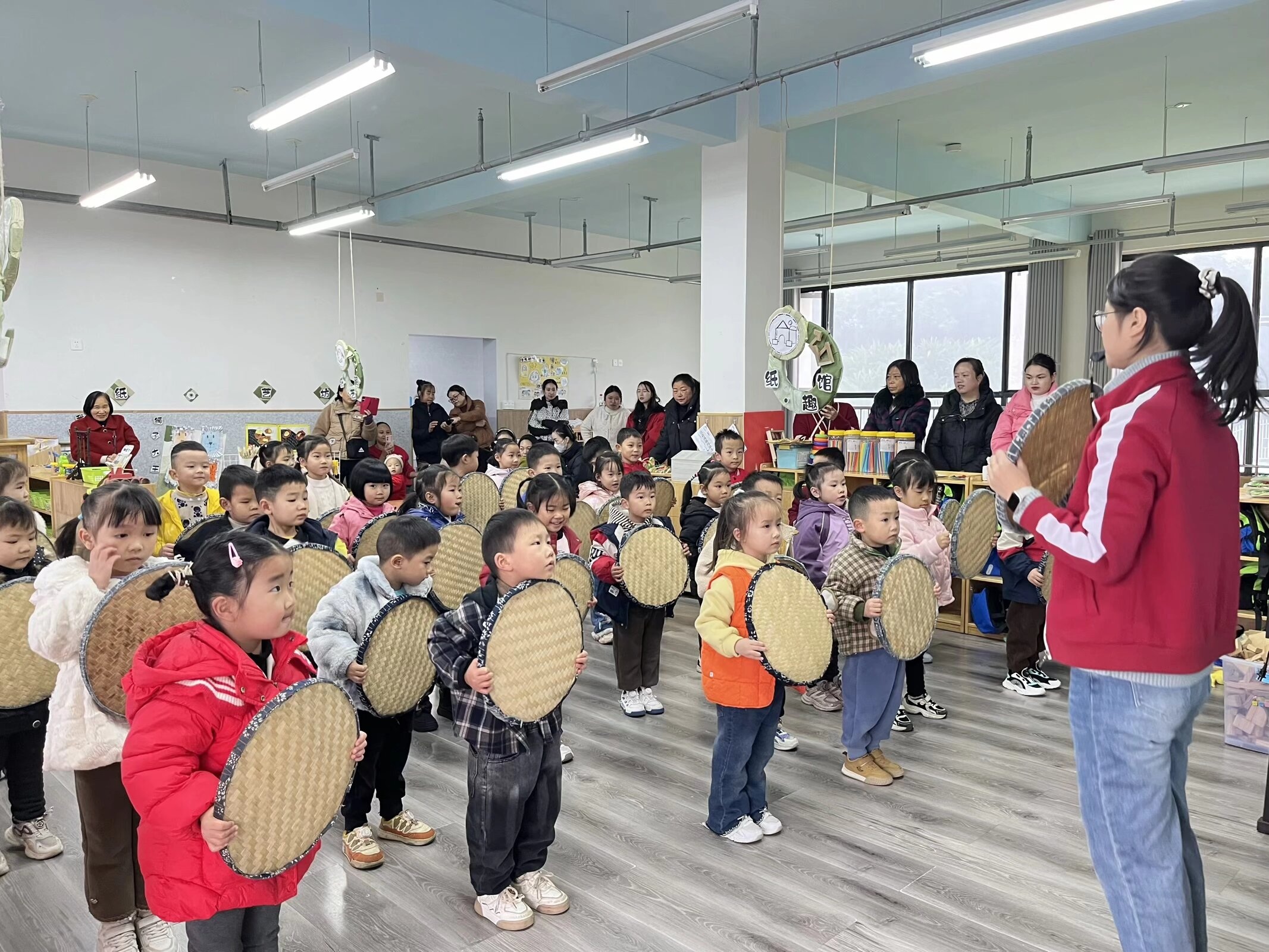 随着欢快音乐响起,趣味早操环节率先登场。面对大雾天气,幼儿园灵活调整场地,将部分活动转移至室内,确保活动“不停档”。室内外活动设计均暗藏巧思:各班教师巧用蕨溪乡土材料,让簸箕、斗笠、竹竿变身“运动道具”,让幼儿在舒展肢体中感受本土文化;户外环节则聚焦动作发展,通过多样运动满足速度、力量、平衡等能力需求,鼓励孩子们勇敢挑战,在尝试中收获自信与快乐。
