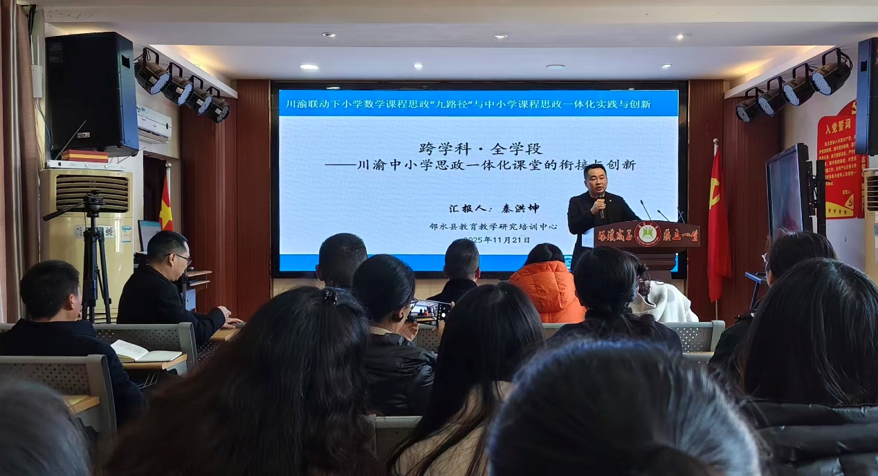 案例分享环节同样“干货满满”。徐媛老师重构“鸡兔同笼”古题,从《孙子算经》中挖掘“数学智慧”;鼎屏小学副校长谭章川分享的“校本思政图谱”,让每位数学教师都能成为“育人导师”。专家讲座环节,黄金全提出“四维九路径”操作框架,用“分书教公平”“笔算讲规则”等生活化案例,生动阐释思政并非“附加题”;秦洪坤则聚焦川渝协同,提出“课标衔接、教学联动”等策略,为跨区域思政教育搭建起一座“连心桥”。