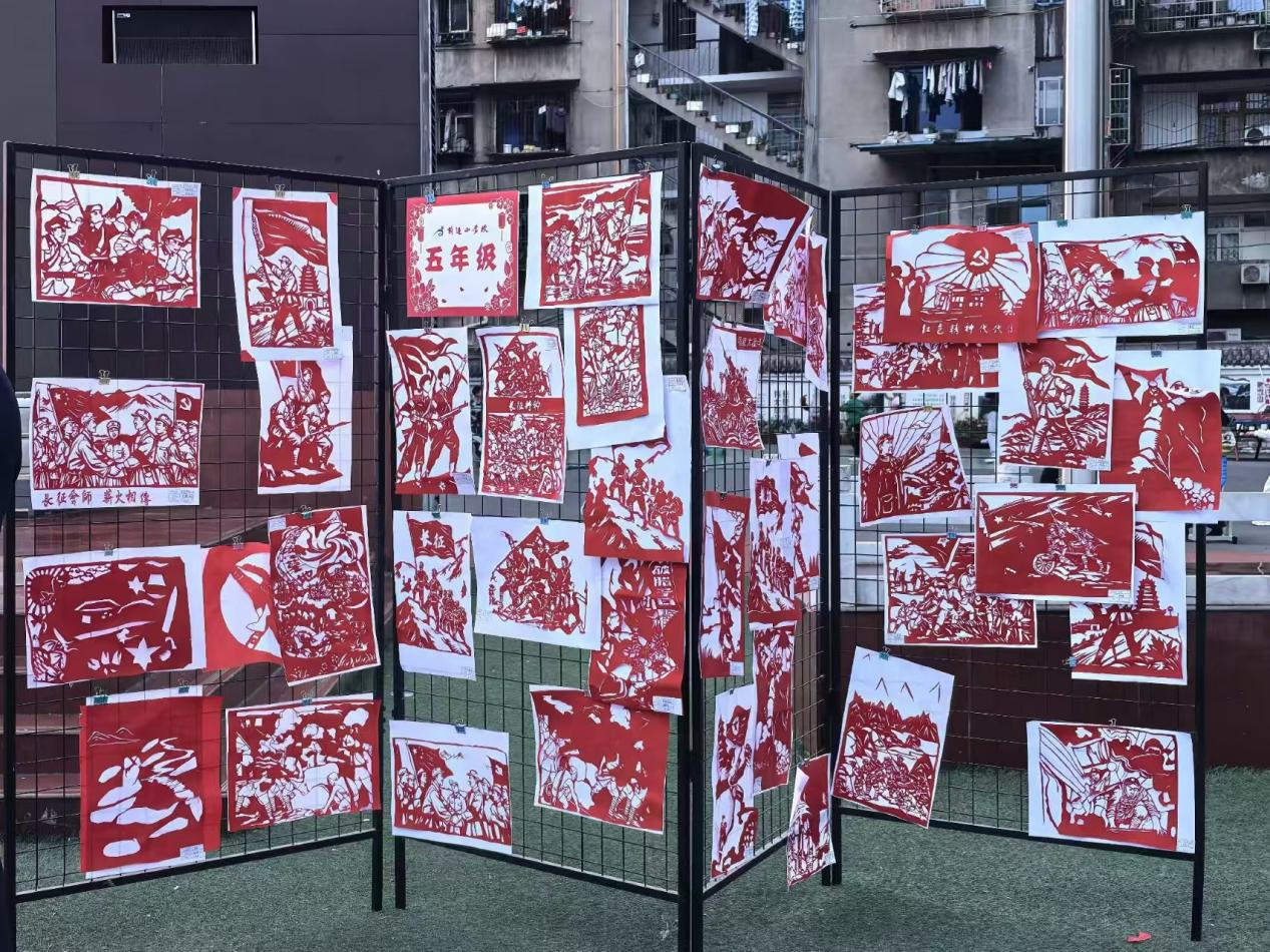 作为“全国中华优秀传统文化传承学校”,前进小学将剪纸艺术融入校园文化内核。本次比赛中,一年级亲子协作创作团花剪纸,二、三年级以“爱国”为主题勾勒家国情怀,四至六年级则以“红军长征”为题材再现红色记忆,各班推选的学生代表手持自备工具,用学校统一的红纸在卡纸上现场剪刻,部分高年级学生还带着提前准备的剪刻稿,在安静的创作中尽显专注。