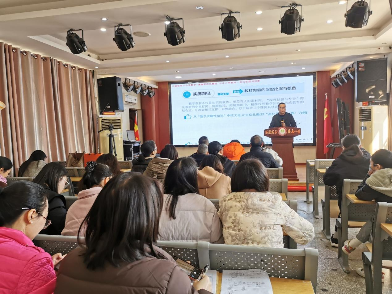 案例分享环节同样“干货满满”。徐媛老师重构“鸡兔同笼”古题,从《孙子算经》中挖掘“数学智慧”;鼎屏小学副校长谭章川分享的“校本思政图谱”,让每位数学教师都能成为“育人导师”。专家讲座环节,黄金全提出“四维九路径”操作框架,用“分书教公平”“笔算讲规则”等生活化案例,生动阐释思政并非“附加题”;秦洪坤则聚焦川渝协同,提出“课标衔接、教学联动”等策略,为跨区域思政教育搭建起一座“连心桥”。