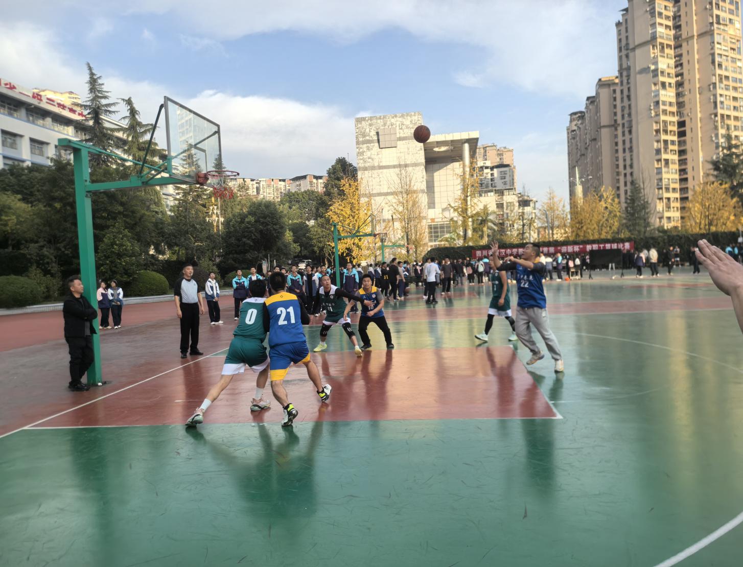 简短的开幕式后,赛事即刻升温。宣汉中学来鹿学校对阵城关学校、本部校区对阵蒲江学校的两场对决同步开启,赛场瞬间被活力点燃。校领导带头登场、身先士卒,以精彩表现拉开赛事序幕,瞬间引爆全场氛围;参赛教职工们褪去讲台的儒雅,化身赛场猛将,抢断、传球、防守、投篮一气呵成,默契的团队配合与顽强的拼搏姿态,每一个瞬间都赢得现场师生的阵阵喝彩。比分交替攀升间,观赛师生的呐喊助威声此起彼伏,热烈的氛围洋溢整个赛场,尽显校园文体活动的蓬勃生机。