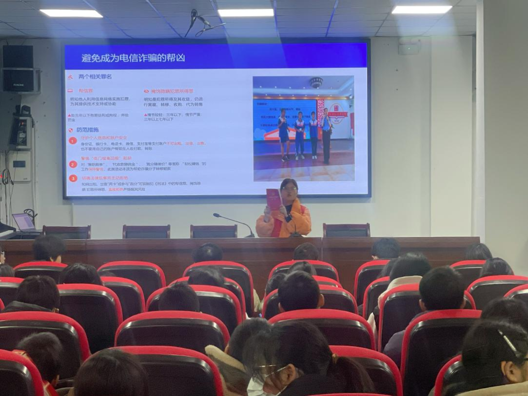 结合当前高发的电信网络诈骗犯罪,讲座还特别警示学生避免成为诈骗帮凶。通过介绍“帮信罪”等真实案例,潘所长告诫同学们要守护好个人证件和支付账户,警惕“低门槛高回报”的陷阱,绝不参与“跑分”等可疑活动,增强防范意识。