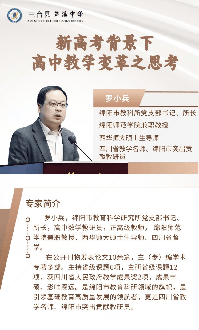 本次研讨会特邀绵阳市教育科学研究所罗小兵所长作专题指导,学校党委书记任双全,党委副书记、副校长尹家兵等校领导与全体教师共同参会。研讨会由学校教科处主任申继萍主持。