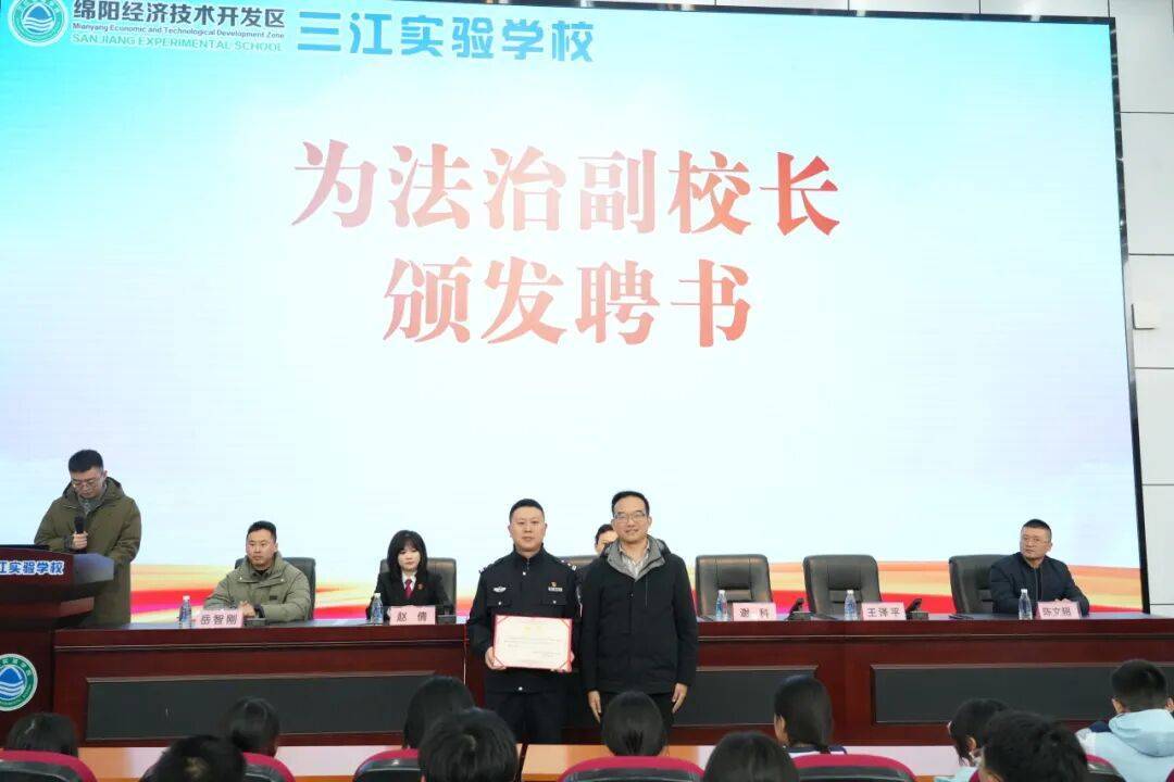 活动伊始,绵阳经开区三江实验学校党总支书记王泽平为雍检察长、赵副院长和谢政委颁发“法治副校长”聘书。