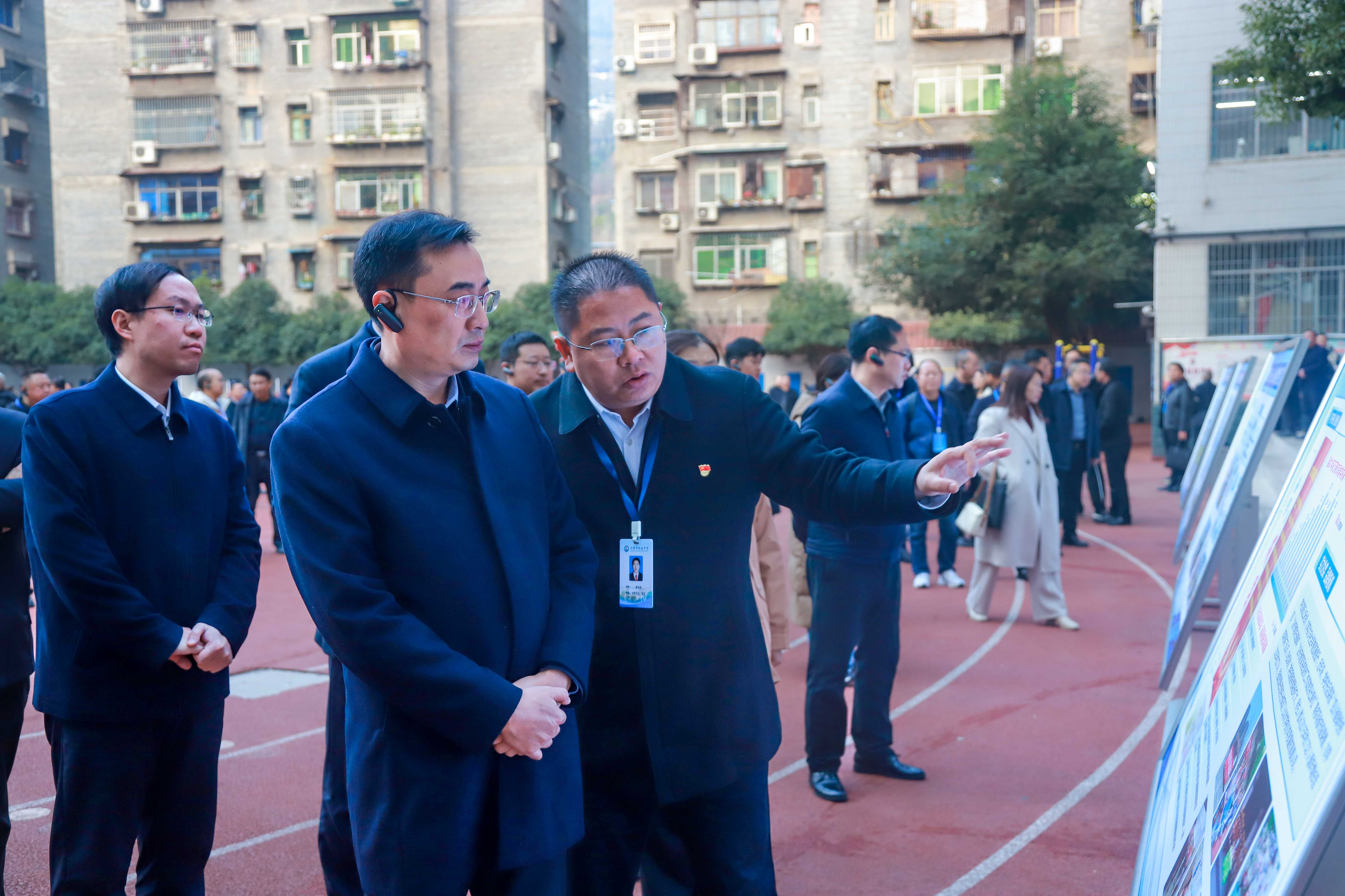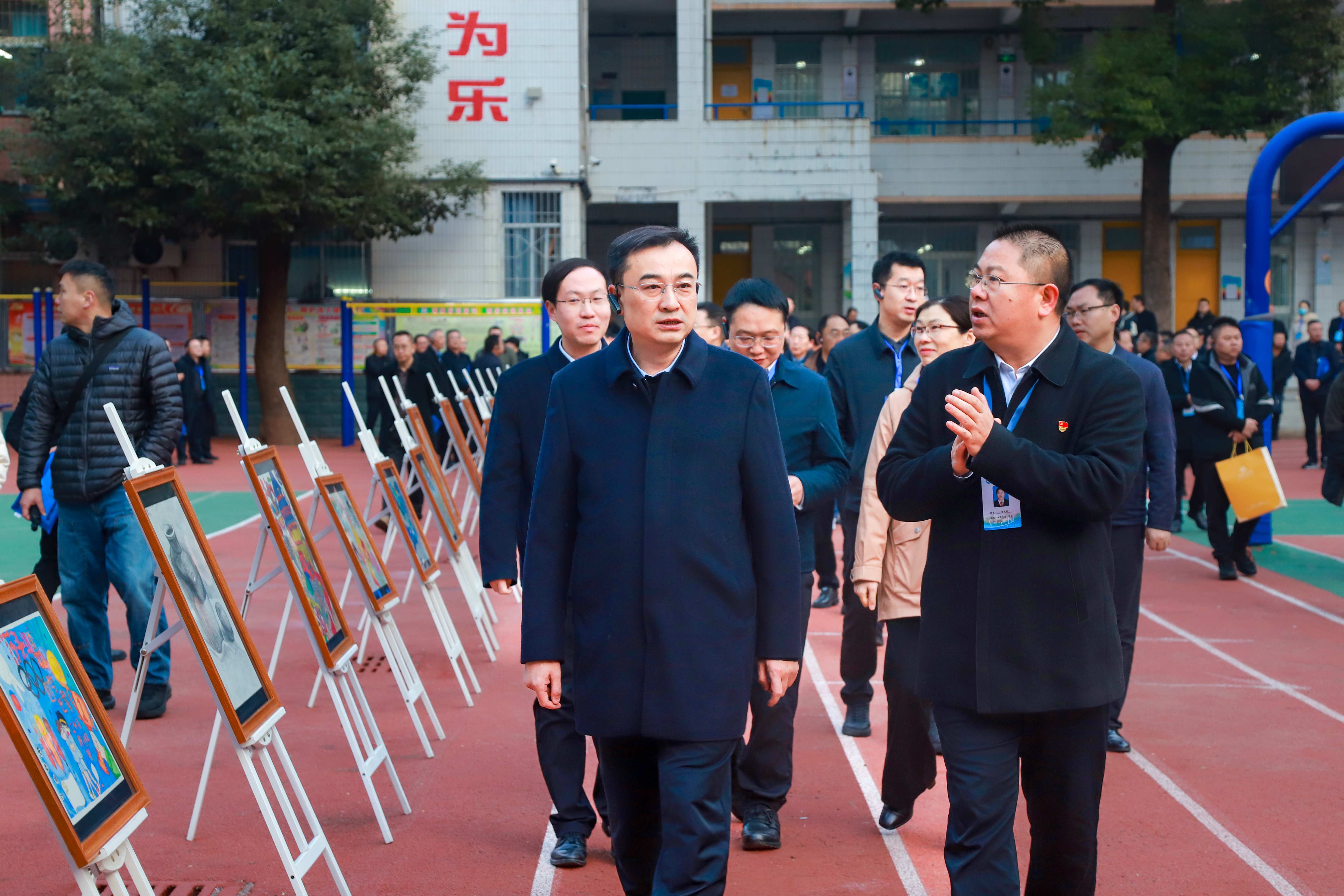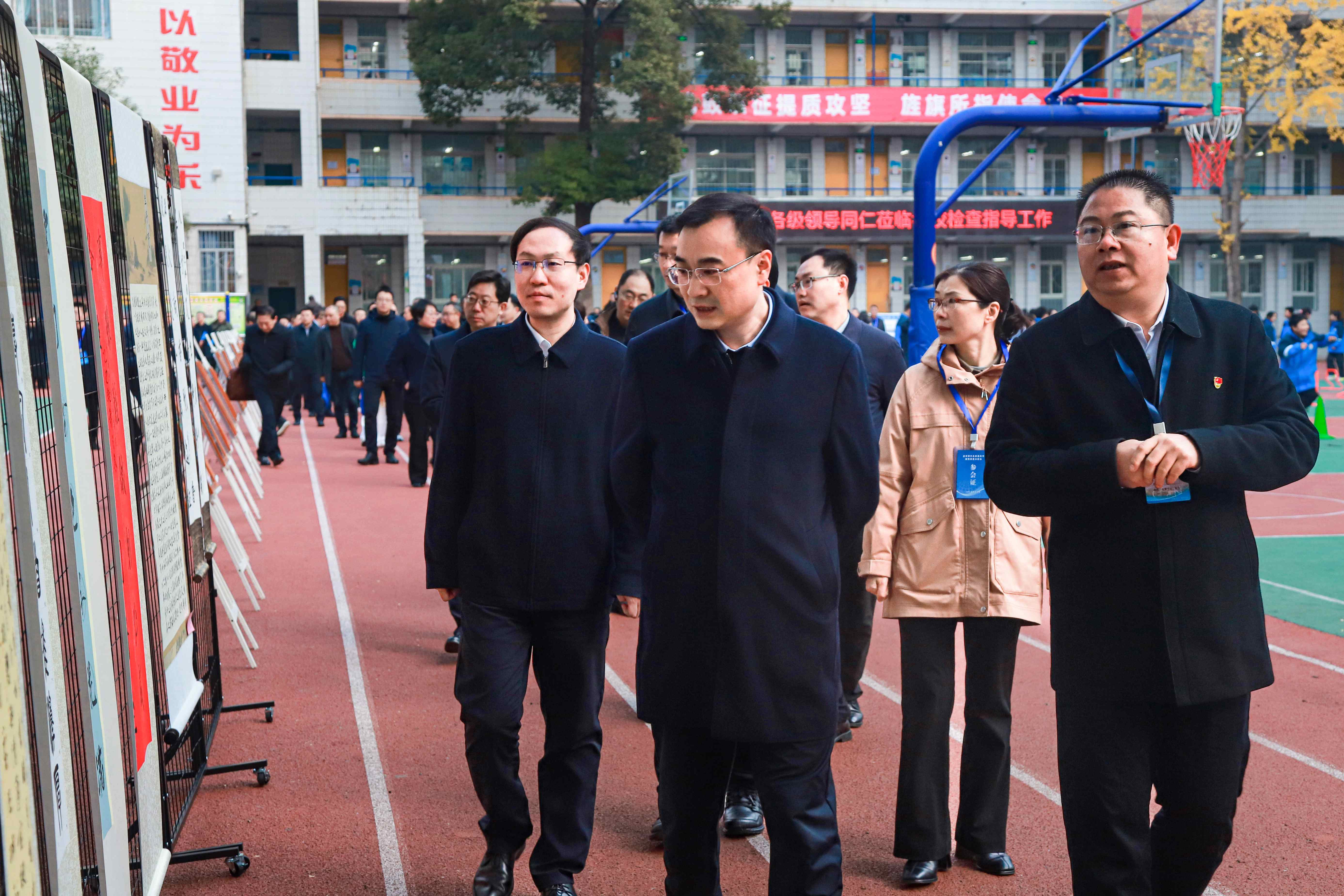 随后,代表们前往操场主题展板区。一组组内容详实、图文并茂的展板有序陈列,全面呈现了学校在管理举措、教师培养机制、教学质量提升路径及素质教育成果等方面的实践经验。代表们驻足研读,不时拍照记录,对该校坚持精细化管理、深耕内涵发展的办学思路给予充分肯定与高度评价。