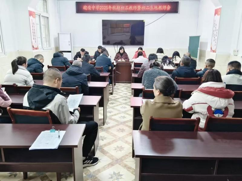 12月8日,江安县迎安镇初级中学校组织召开初三全体教师暨初二生物、地理教师工作会议。会议由该校党支部书记、校长柳霞主持,聚焦毕业班教育教学质量提升与学生全面发展,明确目标,共商策略。