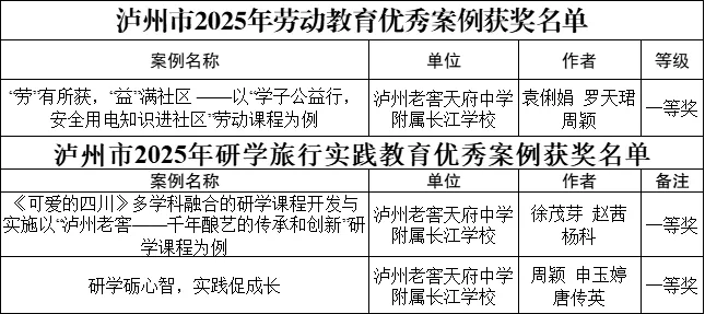 在近日揭晓的2025年泸州市中小学劳动教育与研学旅行实践教育优秀案例评选活动中,泸州老窖天府中学附属长江学校教师撰写的案例荣获三项市级一等奖。