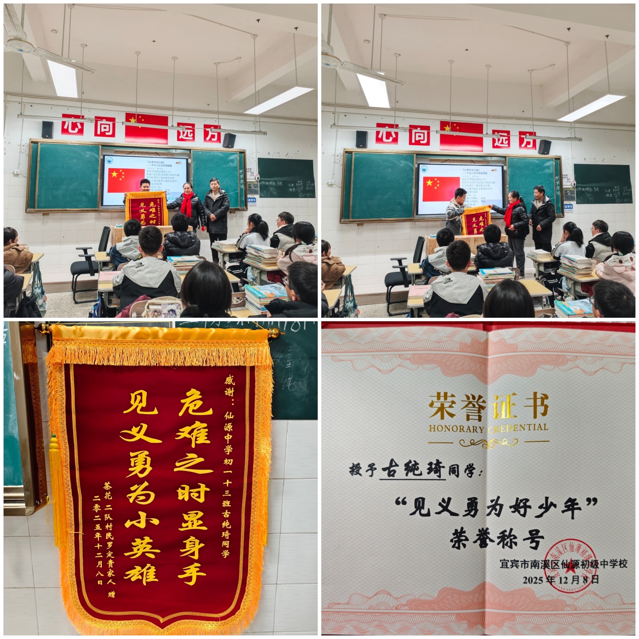 寒冬送暖,善举传扬。近日,仙源初中初一(13)班古纯琦同学见义勇为救起落水老人的事迹,在校园内外传递满满正能量,用少年热血诠释新时代学子的责任与担当!