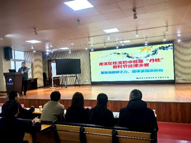 为深化课堂教学改革,夯实教研赋能根基,凝聚教师专业成长合力,12月12日,南溪区桂溪初中首届“丹桂”教科节说课决赛在学校多功能报告厅举行。来自多个学科的参赛教师,以饱满的热情、扎实的专业功底,围绕教材解读、学情分析、教学目标设定、教学过程设计、板书布局、作业分层等核心环节展开说课。