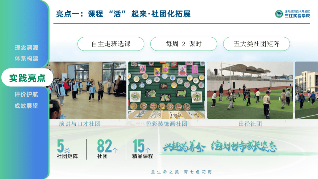 自课程体系实施以来,我校已形成鲜明育人特色:82个特色社团让学生自主选课、个性成长;20门跨学科探究课程,让学生在“解密报恩寺”“三江流域探秘”等真实场景中综合运用知识;教学楼顶的“天空农场”成为劳动教育生动课堂;九年一贯制贯通培养体系,助力学生从兴趣萌芽到素养深耕稳步进阶。办学三年来,学生在机器人大赛、航天科技创新大赛等赛事中斩获市级以上奖励86项,教师9项课题获省市区级立项,学校先后获评全国青少年校园足球特色学校、全国首批航天科技教育基地校等多项荣誉,课程育人成效日益凸显。