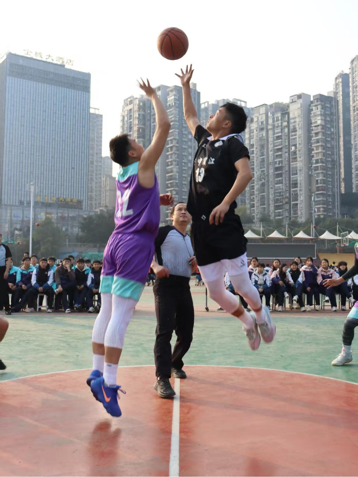 在简短、欢乐的开场表演后,紧张激烈的最终对决正式打响。本次决赛分两场同时进行:宣汉中学高中校区与宣汉中学蒲江校区展开冠军争夺战,宣汉中学来鹿校区同宣汉中学城关校区角逐季军荣誉。赛场上,队员们攻防有序、每球必争,漂亮的抢断、精准的投篮、默契的配合引得场下观众欢呼不断,现场气氛热烈而激昂。