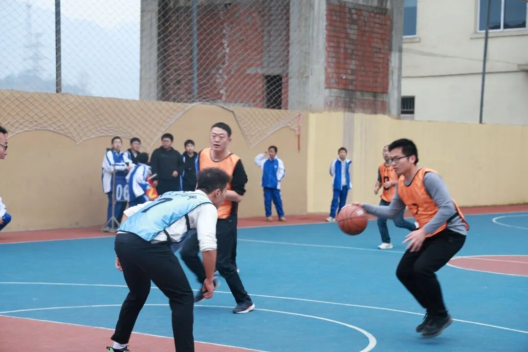 运动会共设四个集体比赛项目,在敲响幸福项目中,队员们蒙住双眼,原地旋转后摸索前行敲响铜锣,现场笑声与加油声不断,紧张又充满乐趣。鲁班连环锁则考验团队的默契与协作,队员们手拉手快速传递呼啦圈,展现了紧密无间的配合。传统的拔河比赛将气氛推向高潮,各队齐心协力,奋力拼搏,呐喊助威声响彻全场。最后的篮球友谊赛在体育组与非体育组之间展开,双方队员攻防有序,精彩瞬间频现,充分体现了“友谊第一,比赛第二”的体育精神。