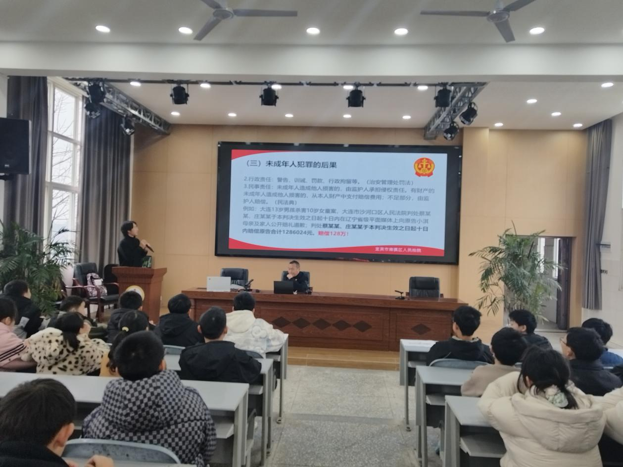 在未成年人犯罪专题部分,主讲人员结合《中华人民共和国预防未成年人犯罪法》等相关法规,通过典型案例解读了未成年人犯罪的常见类型、诱发原因及严重后果,引导同学们认清“小恶不制必成大患”的道理。同时,还普及了正当防卫知识,指导同学们在遭遇不法侵害时依法自我保护。