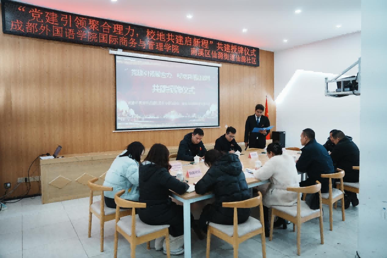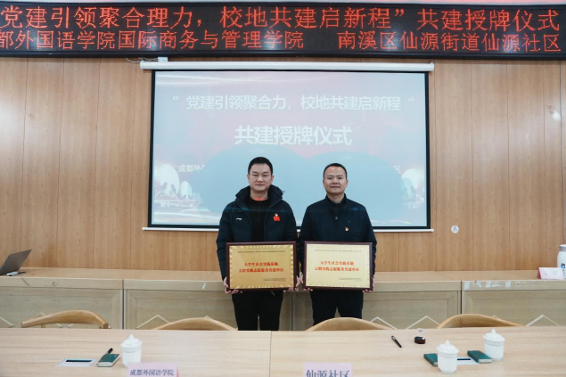 冬意渐浓情更暖,携手共建启新篇。为深化校地合作纽带,实现高校资源与地方需求精准对接、双向赋能,12月26日上午,成都外国语学院国际商务与管理学院与仙源街道仙源社区“党建引领聚合力,校地共建启新程”共建授牌仪式在仙源社区二楼会议室举行。