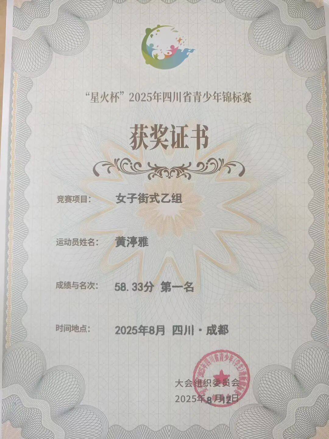 小学部4.2班黄渟雅同学荣获“星火杯”2025年四川省青少年轮滑锦标赛第一名。