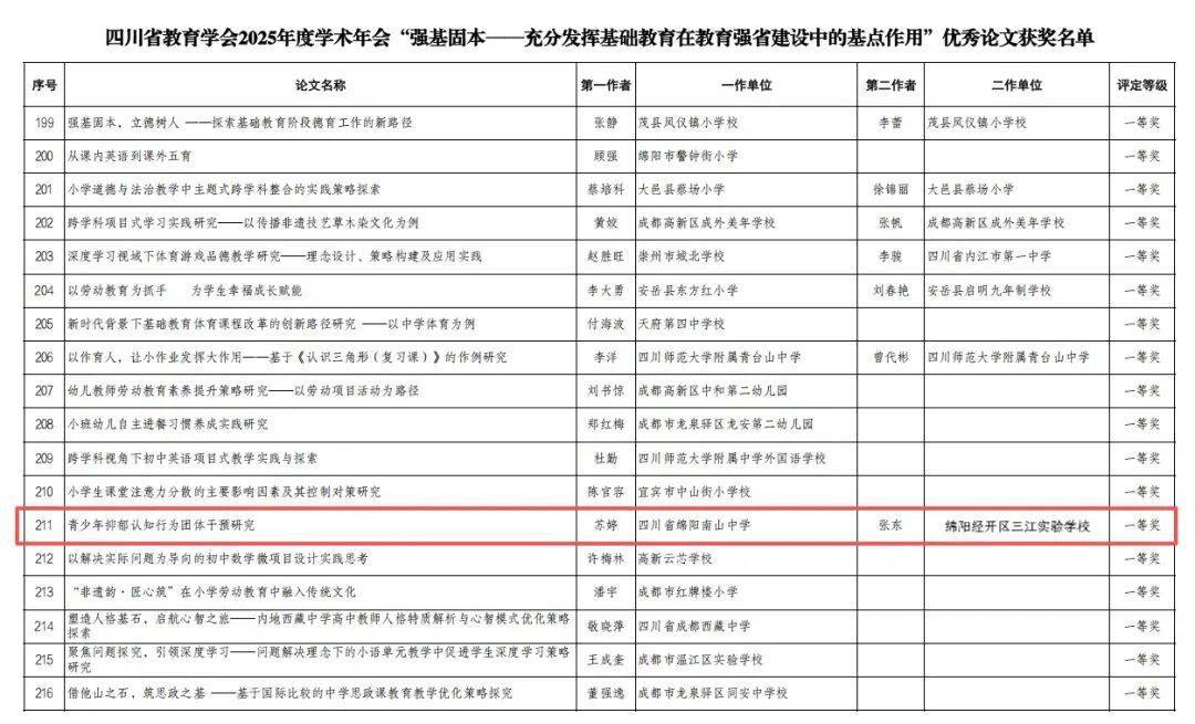 在 2025 年度学术年会“强基固本——充分发挥基础教育在教育强省建设中的基点作用”优秀论文评选活动中,我校张东副校长的论文《青少年抑郁认知行为团体干预研究》荣获省级最高奖一等奖;