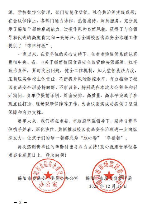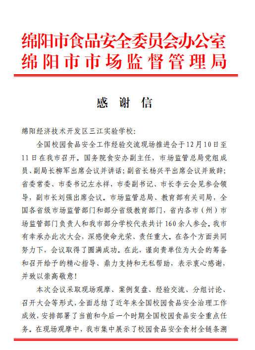 2025年12月10日,全国校园食品安全现场推进会在绵阳召开。我校凭借在责任落实、工作机制、智慧监管方面的显著成效,从全国众多学校中脱颖而出,被推荐为全国现场示范观摩点(全国仅两所学校获此殊荣,三江实验学校作为现场示范观摩点,深圳二高在会上作经验交流)。教育部、市场监管总局有关司局领导和来自全国各省、直辖市、自治区的省级部门领导亲临我校观摩指导,对校园食品安全工作的创新实践与扎实成效给予一致好评,让“三江后勤”成为全国校园食品安全保障的标杆。