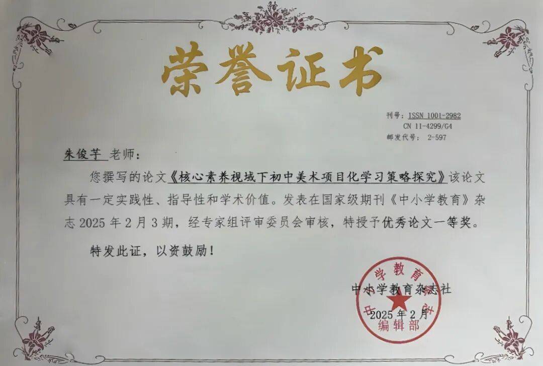 朱俊芋老师撰写的科研成果类论文在国家级中小学教育期刊论文评比中获一等奖;
