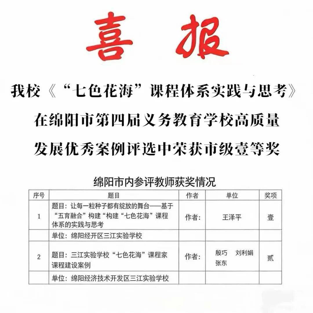 荣誉接踵而至,奋斗从未停歇。2025年12月19日,在绵阳市第四届义务教育学校高质量发展校长研讨会上,课程体系建设案例在大会上现场交流分享。由党总支书记王泽平主持申报的《让每一粒种子都有绽放的舞台——基于“五育融合”构建“七色花海”课程体系的实践与思考》课题体系建设案例斩获市级最高奖一等奖;殷巧、刘利娟、张东老师团队申报的《三江实验学校“七色花海”课程建设案例》荣获市级二等奖。