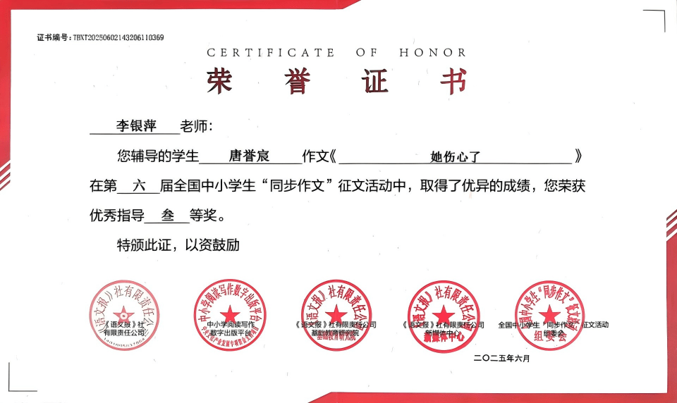 李银萍老师在第六届全国中小学生“同步作文”征文比赛中获优秀指导教师奖;