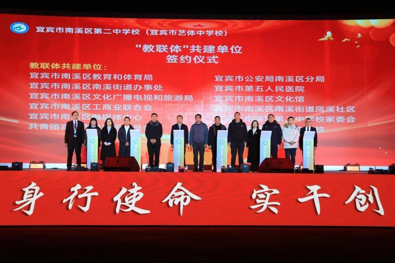签约环节成为全场焦点。在“教联体”共建签约中,南溪二中与区教育和体育局、南溪街道、区文广旅游局、区工商联、区融媒体中心、南溪团区委、宜宾市第五人民医院、南溪公安分局、区文化馆、凤溪社区及学校家委会等12家单位分两轮完成签约。此举旨在整合多元社会资源,联动家校社协同育人。