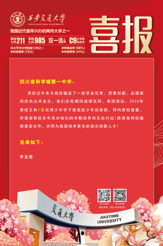 高一年级唐鑫鑫入选教育部中学生 “英才计划”,高二年级赵文楷、李卓阳、蒋奕可包揽2025年四川省“天府英才计划”绵阳市全部席位!