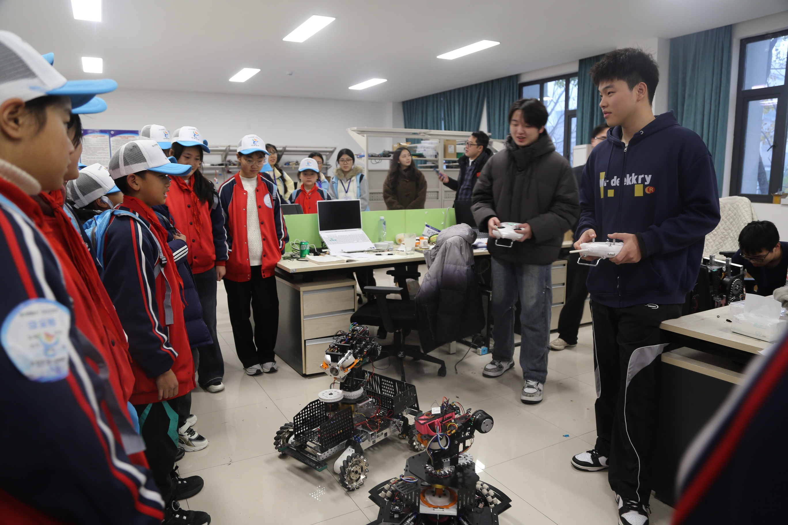 午后的翼空智控无人机基地更是点燃了大家的热情。“翼空飞行大课堂”上,无人机百年发展历程徐徐展开,从早期雏形到如今在各行各业广泛应用的发展历程,一个个鲜活案例让同学们深深折服。最令人期待的体验环节中,大家化身“小小航天员”,沉浸式感受神舟飞船舱内的AI模拟场景;又变身“飞行驾驶员”,亲手操控无人机,在专业指导下完成起降、转向等动作,亲身解锁飞行的乐趣与科技的魔力。