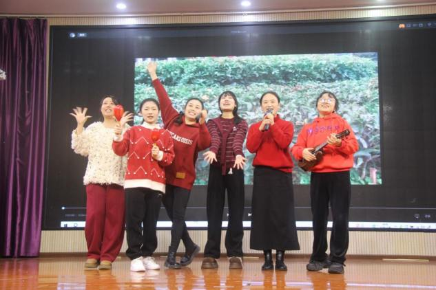 晚会节目精彩纷呈,高潮迭起。音乐组教师以《马跃龙腾》点燃全场激情,五年级组创意演绎改编歌曲,幽默诠释育人日常;后勤职工用铿锵合唱《走进新时代》表达奋进心声;四年级组通过配音节目真实还原教师工作的酸甜苦辣,引发深深共鸣。英语组教师别出心裁带来《睡衣派对·欢乐舞狂想》,轻松活泼的走秀与舞蹈串烧赢得满堂喝彩;二年级组以 “我快乐,我幸福!因为奋斗的青春最美丽!” 的响亮口号,传递出教师们在教育路上奋勇拼搏的朝气与活力。六年级组小品《老同学显摆大会》妙趣横生,笑声不断;三年级组则以年终总结《我永远是最靓的教书匠》和歌曲《此生无憾》,道出教育人的无悔坚守。