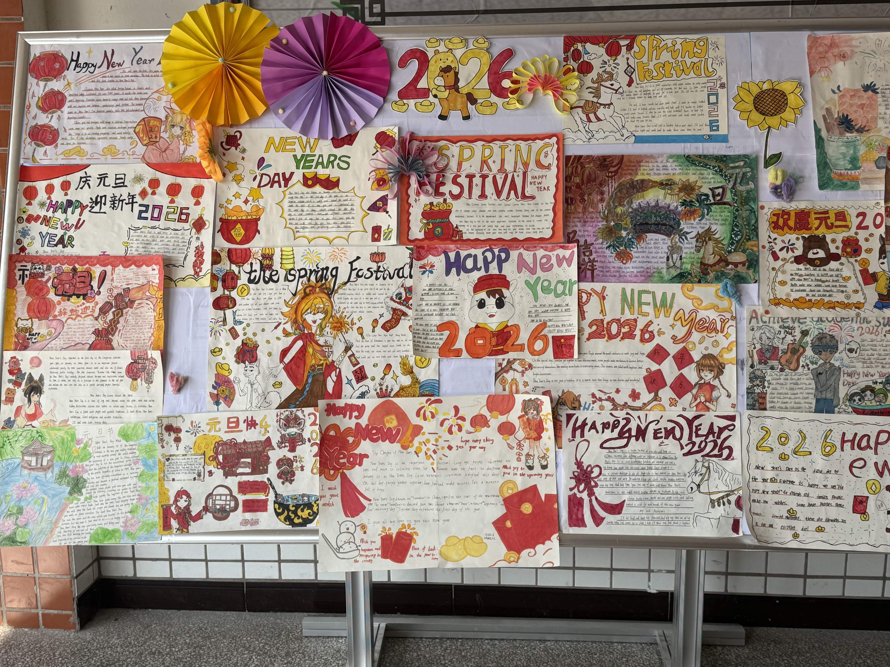 本次活动紧扣“探寻传统”与“畅想未来”双核心,得到了全校师生的积极响应。七八年级学生充分发挥主观能动性,在创作中同学们精益求精:语言表达上,力求无拼写与语法错误,语句流畅自然、用词精准恰当;视觉设计上,精心布局版面、协调色彩搭配,通过手绘插图、创意排版凸显元旦的喜庆氛围,展现出扎实的艺术审美功底;原创性上,作品坚持手绘设计与原创内容,杜绝网络素材直接打印粘贴,彰显了竹中学子求真务实的学习态度与丰富的创造力。
