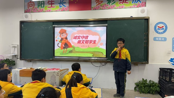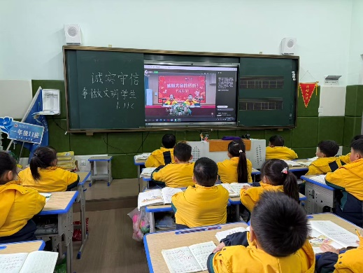 课堂上,一年级11班的孩子们身着统一的黄色校服,端正坐在课桌前,目光聚焦于屏幕上的直播内容,黑板上“诚实守信 争做文明学生”的粉笔字格外醒目,与直播画面形成呼应,将诚信的理念直观地呈现在孩子们眼前。五年级6班的课堂则更具互动性,一名学生勇敢走上讲台,手持话筒结合直播主题分享自己对“诚信”的理解与感悟,用真挚的表达带动全班同学思考,台下同学认真倾听,课堂氛围热烈又庄重。