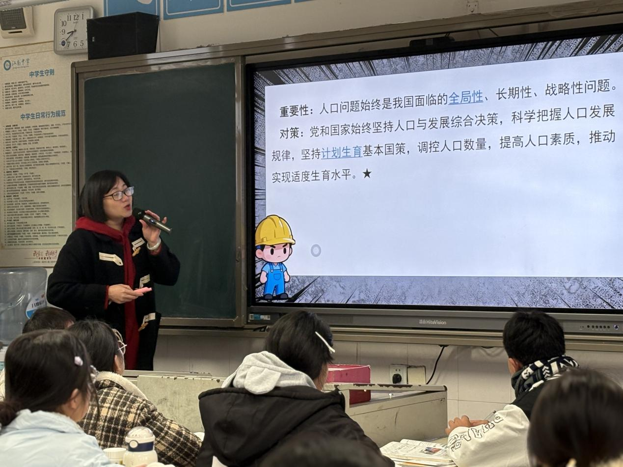 来自南溪区外国语实验学校李银老师则在9.3班执教《正视发展挑战》复习课,李老师紧扣时政热点,引导学生结合教材知识剖析现实问题,让政治复习更具实践性与针对性。