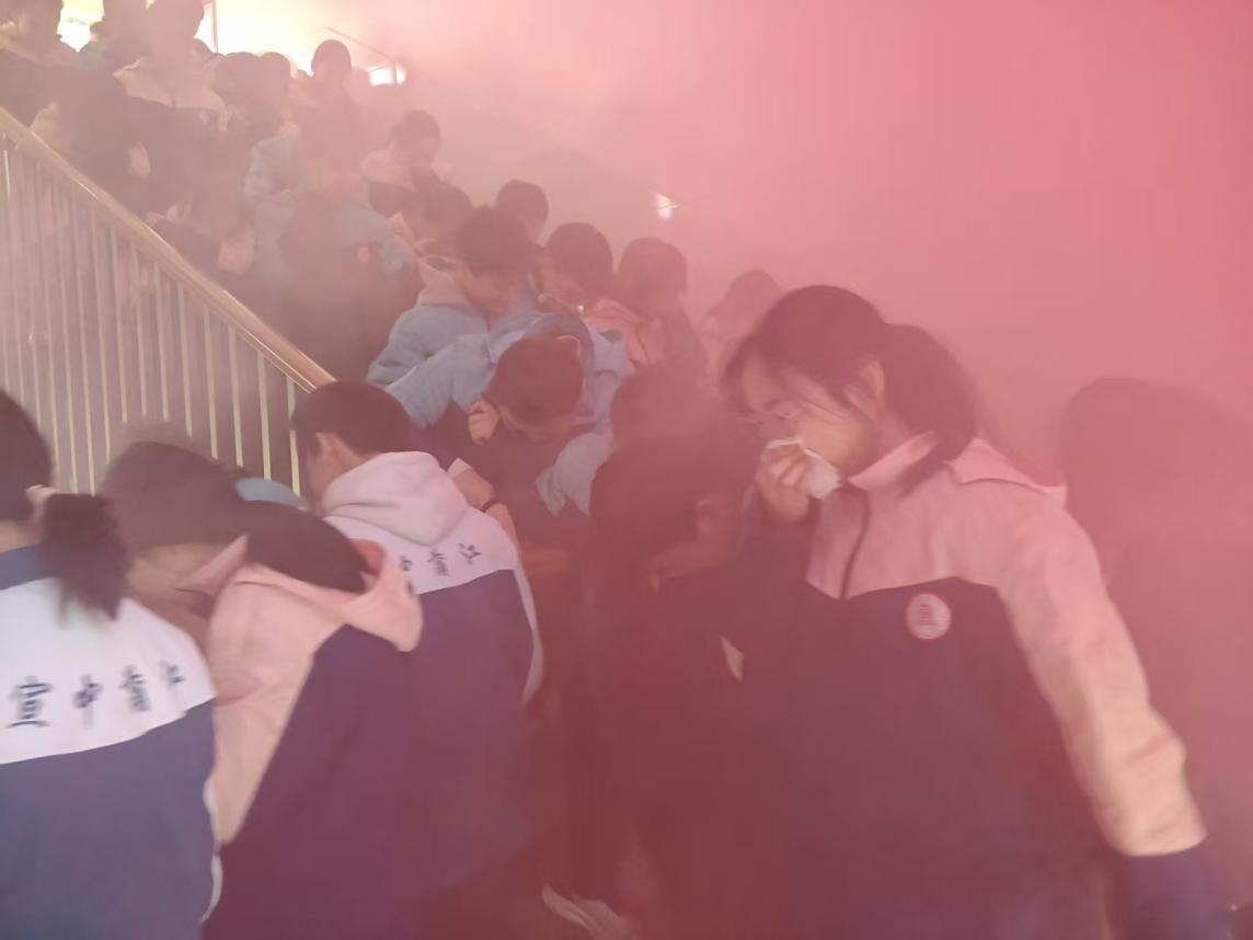 1月8日上午9时40分,消防警报声响起,演练正式开始。各班任课教师立即按照预案组织学生,用湿毛巾捂住口鼻,弯腰低姿,分两队从教室前后门有序撤离。疏散引导组教师提前到达楼梯口、转角处、走廊等关键位置,引导学生保持秩序、稳步快速通过,有效防止了拥挤和踩踏风险。全体师生沿预定路线迅速、有序地撤离至运动场指定区域。随后,各班班主任清点人数,并向现场指挥组汇报,确保无一遗漏。