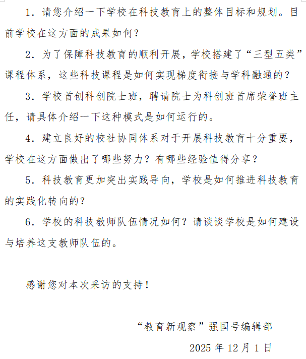 近期,教育部等七部门联合印发《关于加强中小学科技教育的意见》,首次提出“科技教育”概念。“科技教育是破解‘重知识传授轻实践创新’‘重学科独立轻跨界融合’等教育痛点的重要抓手。”科学城一中党委书记邓友山说道。