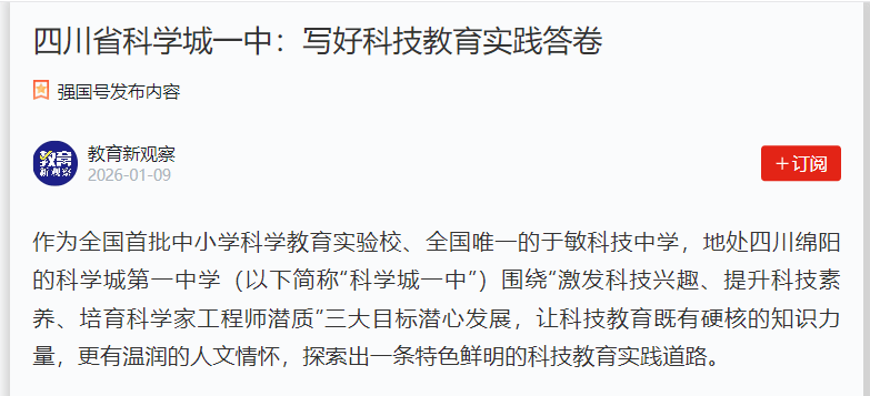 学习强国以《四川省科学城一中:写好科技教育实践答卷》为题,专题报道我校在科技创新教育领域的特色实践与育人成果,全面展现了学校作为全国首批中小学科学教育实验校、全国唯一于敏科技中学的担当与风采。