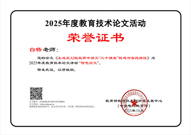 据悉,全市仅7篇论文进入全国展示环节,其中“特色论文”共3篇。作为泸州市入选该类别的重要成果之一,白杨老师的论文以其前瞻性、实践性与逻辑性,展现了泸州老窖天府中学教师在教育信息化研究与学科融合方面的深厚功力。学校在教育数字化改革中持续推进、勇于创新,此次“特色论文”与“省一等奖”的双重认可,进一步巩固了学校在教育技术应用与研究领域的区域引领地位。未来,学校将持续支持教师开展技术融合的教学创新,推动教育教学向智能化、个性化方向纵深发展,助力学校高质量发展。