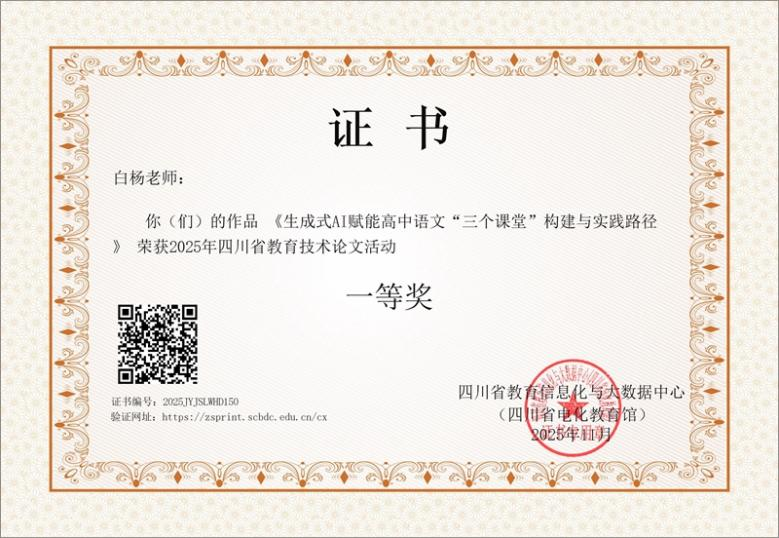 1月7日,泸州市教育技术装备管理所通报2025年度教育技术论文活动获奖结果。泸州老窖天府中学教师白杨的论文《生成式AI赋能高中语文“三个课堂”构建与实践路径》荣获省级一等奖,并入选教育部教育技术与资源发展中心2025年度教育技术论文活动“特色论文”推荐名单。