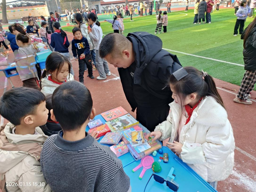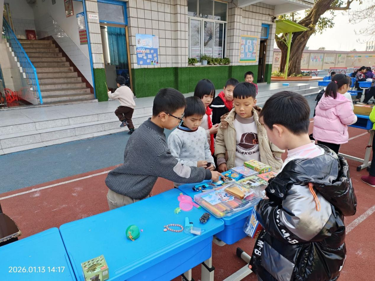 “走过路过不要错过!”“这里有凉面、卤味便宜卖了!”足球场上,班级摊位区吆喝声、议价声此起彼伏。除了常规物品交易区,不少班级还专门设置了“旧物交易区”,也就是孩子们口中的“跳蚤市场”。许多旧书籍、旧玩具在这里找到了新主人,交易方式可以是成长币购买,也可以物物交换。