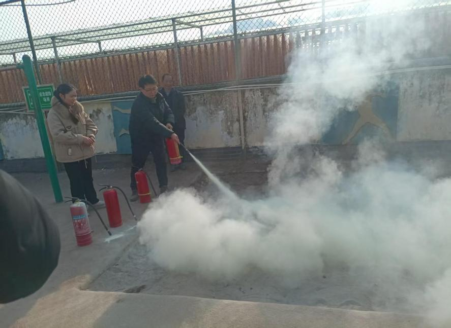 紧接着,张家荣主任现场演示了干粉灭火器的正确使用方法。他一边讲解“提、拔、握、压”四字口诀,一边对准模拟火源进行精准喷射,动作规范、一气呵成,为参训人员树立了标准的操作样板。