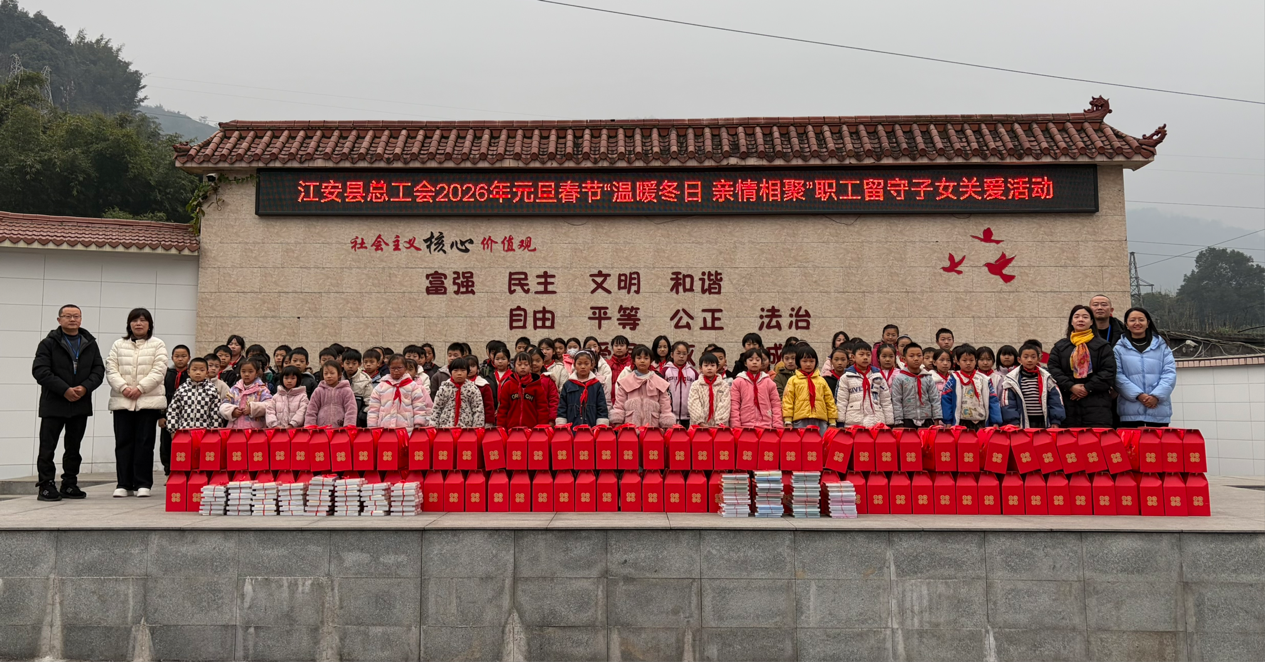 1月19日,江安县总工会一行带着浓浓的关怀与温暖,走进五矿小学,开展了一场以“温暖冬日 亲情相聚”为主题的慰问留守儿童关爱活动,为孩子们送上了真挚的问候与实用的礼物。
