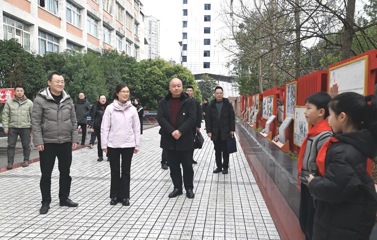 调研组一行首先参观大竹县第三小学校园文化建设成果。在“红领巾”讲解员带领下,调研组现场观摩了校园红色文化长廊、国学经典展区等特色文化空间,并听取讲解员们关于“竹韵少年”德育品牌的生动讲解,对其展现的新时代少年综合素质与精神风貌给予高度评价。