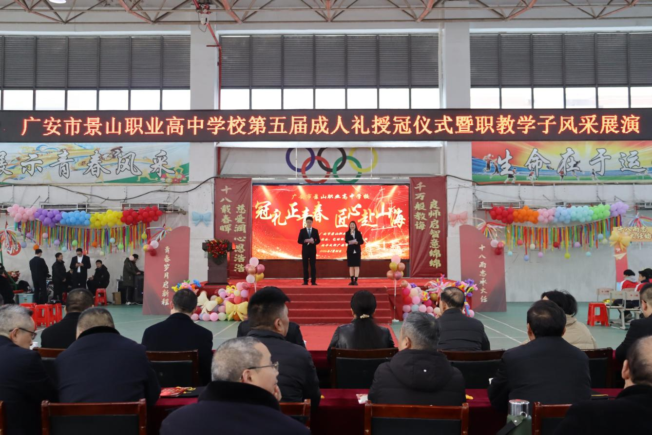 1月16日,广安市景山职业高中体育馆内旌旗飘扬、暖意融融,第五届“冠礼正青春,匠心赴山海”成人礼授冠仪式暨学生风采展演活动隆重举行。区教育工委书记、区教科体局党组书记、局长张伟,区委统战部常务副部长陈湘蜀,区市场监管局党组成员、安全总监陈俊荣等30余位领导嘉宾,与广安市汽车行业商会、餐饮协会等行业协会代表,邓家盐皮蛋、金广安酒业、重天下火锅等企业赞助单位代表,新育才教育集团及校友会代表,广安二中、武胜职业中专等兄弟学校师生代表,以及100余名高三学生家长齐聚一堂,共同见证高三学子迈向成人的庄严时刻。