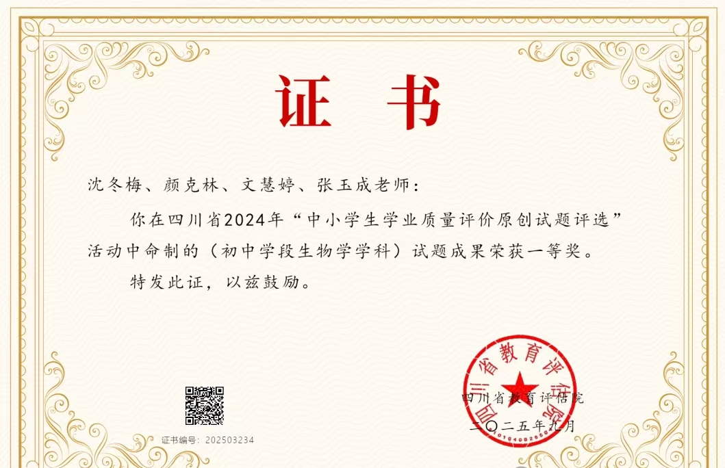 近日,从四川省教育评估院传来喜讯,南溪四中沈冬梅、颜克林、文慧婷、张玉成四位教师命制的初中学段生物学科试题,在四川省“中小学生学业质量评价原创试题评选”活动中荣获一等奖。这一优异成绩,充分彰显了宜宾市南溪四中教师在生物教育教学研究与试题命制领域的扎实功底与创新精神。