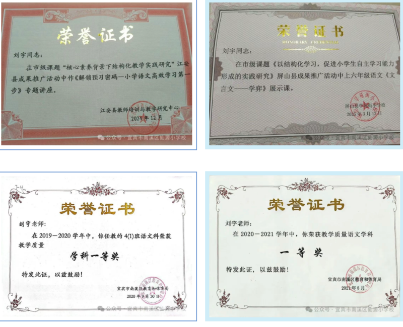 载春秋流转,一片丹心育桃李。刘宇老师的坚守与付出,收获了累累硕果与满满赞誉:先后荣获“宜宾市优秀教师”“宜宾市骨干教师”“南溪名师”“工作实绩突出班主任”等称号,但面对鲜花与掌声,她始终谦逊:“我只是做了一名教师该做的事,看到孩子们在书香里成长,在阅读中找到自信与快乐,就是我最大的幸福。”