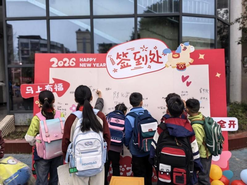 “签到处”展板格外醒目,红底白字的“马上有福”“马力全开”标语,搭配上可爱的卡通小马形象,瞬间点燃了孩子们的热情。同学们有序地在签到板上留下自己的名字,开启新学期的第一份仪式感。