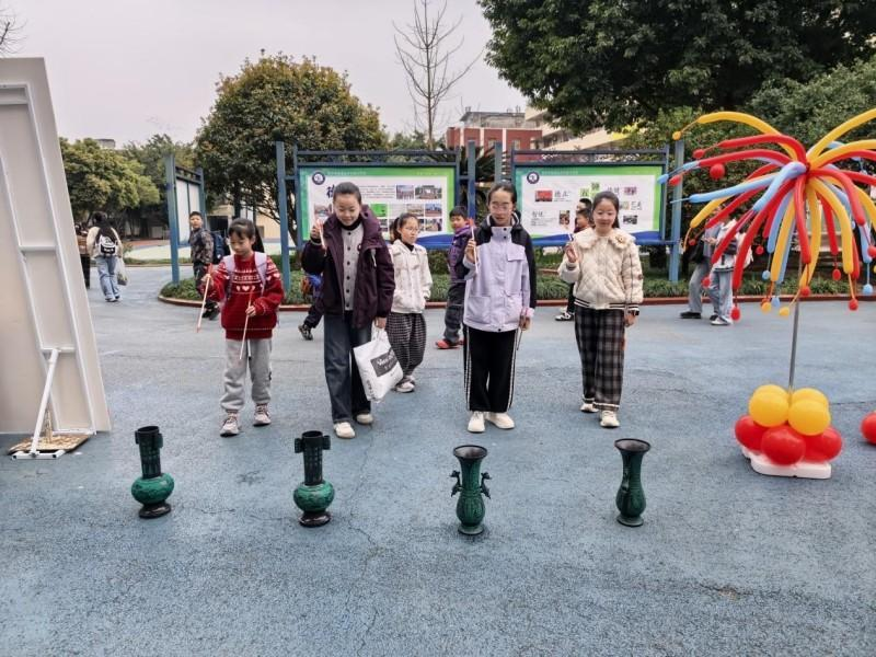 清晨,校园内,色彩缤纷的气球点缀在各个角落,有烟花造型的、五彩花束造型的,让整个校园充满了生机与活力。“稚笔传福”活动区吸引了众多同学驻足。展板上“提笔纳百福,落笔皆平安”的寄语,搭配上可爱的小马形象,孩子们拿起毛笔,在“福”字贴纸上认真书写,一笔一画间,满是对新年的美好期许。旁边的“投壶纳福”游戏区更是热闹非凡,孩子们手持箭支,瞄准壶口,在传统游戏中感受着传统文化的魅力,投中者还能获得小奖励,现场欢声笑语不断。